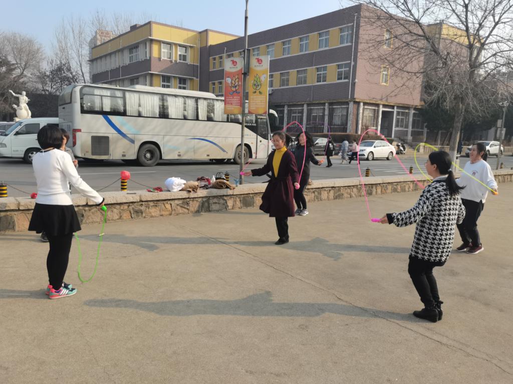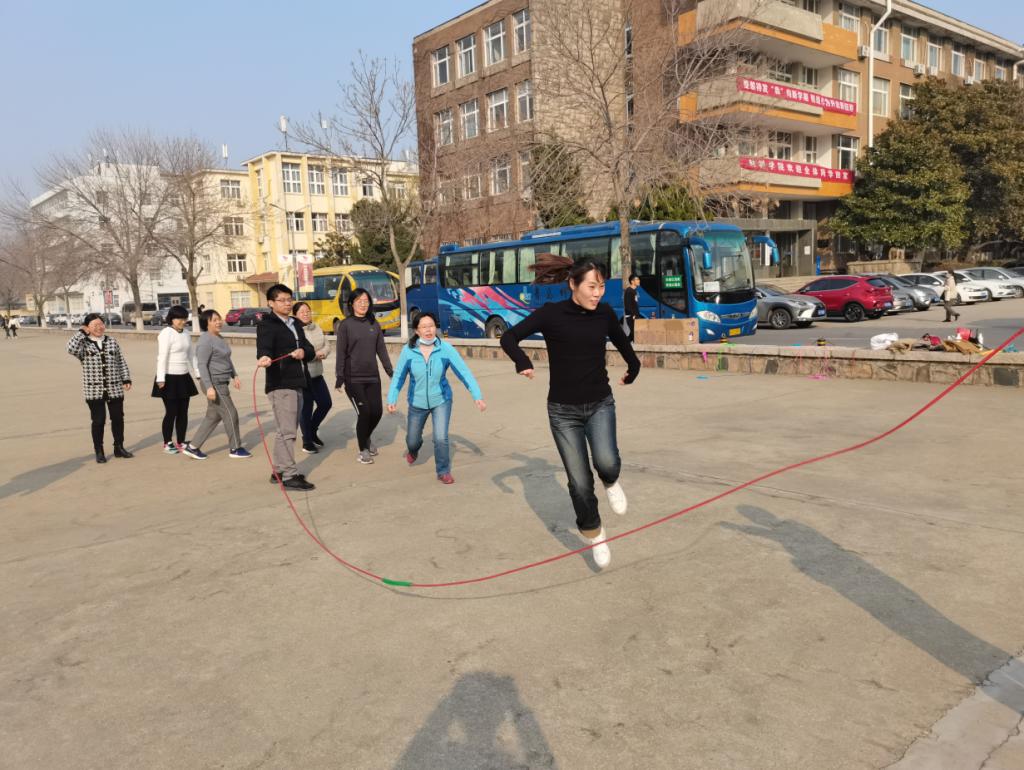 2021年3月9日下午15:30,老师们来到小五四广场。活动分为跳绳和踢毽子比赛。活动中,每位参赛女教师都充满了活力与热情,脸上挂满了笑容,挥动手中的跳绳,身轻如燕,各显身手,互不相让。观看比赛的老师谈笑风生,其乐融融。活动最后一项是跳大绳,由男教工配合摇绳,女教师齐上阵。摇绳的老师抡圆了有力的臂膀,跳绳的老师步调一致,加油的老师齐声呐喊,比赛如火如荼地开展,全体女教师沉浸在欢乐与祝福声中,感受着节日里运动带给她们的快乐。