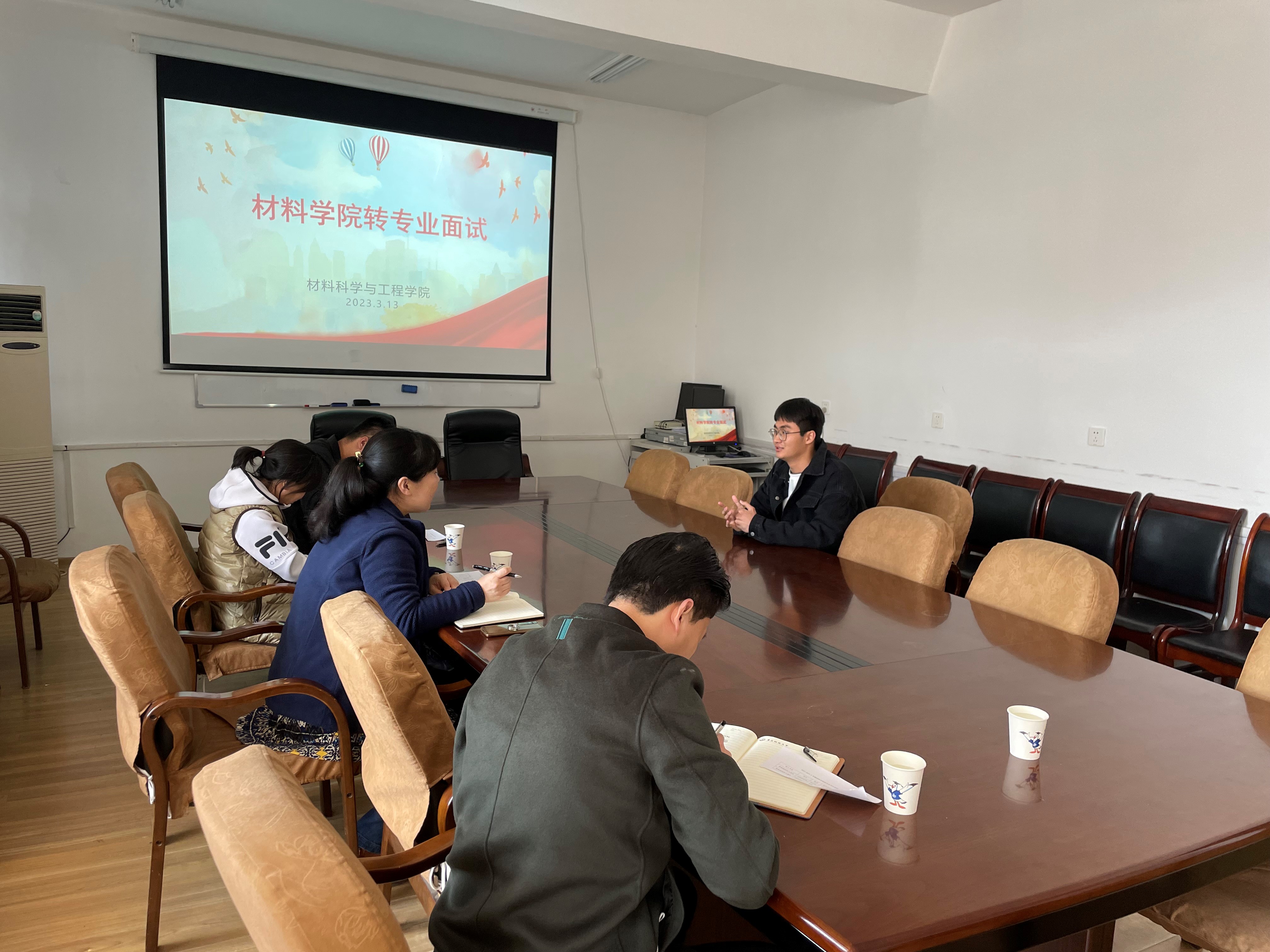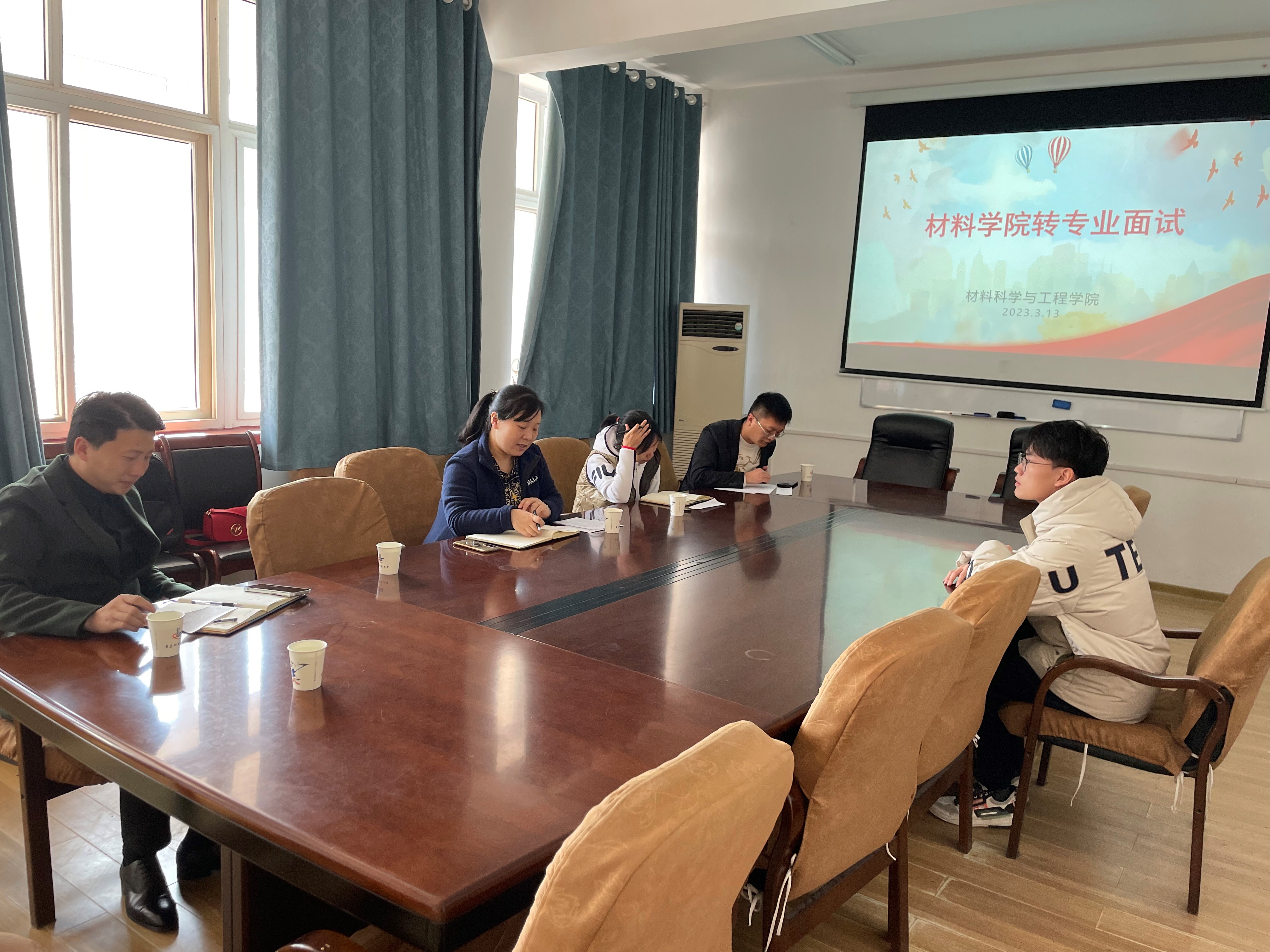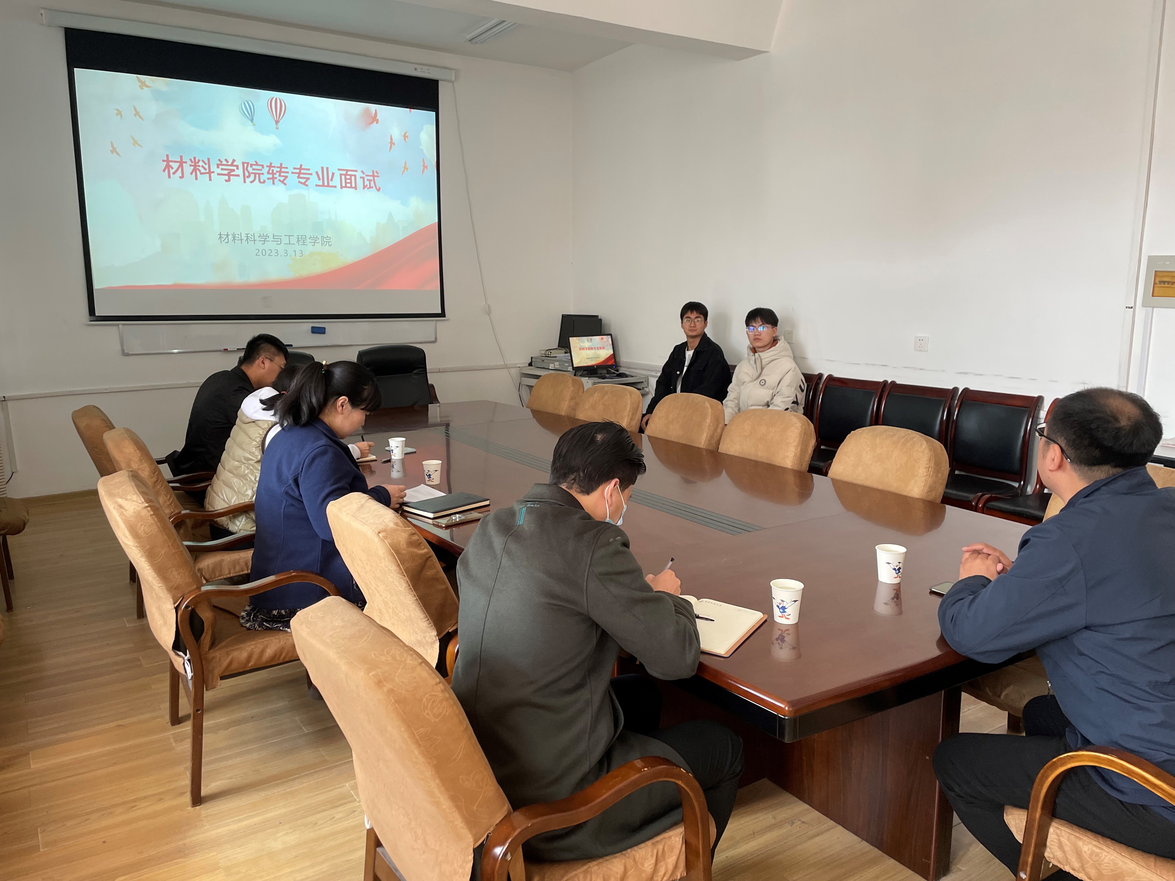 3月13日下午,公司在203会议室举行转专业面试。面试评委有公司副经理于薛刚,能材专业负责人孙琼老师,能材专业班主任王莉和白强老师,以及公司学工办刘亚鑫老师。参加面试是海洋公司轻化工程专业的两位同学,他们希望加入公司新能源材料与器件专业。
