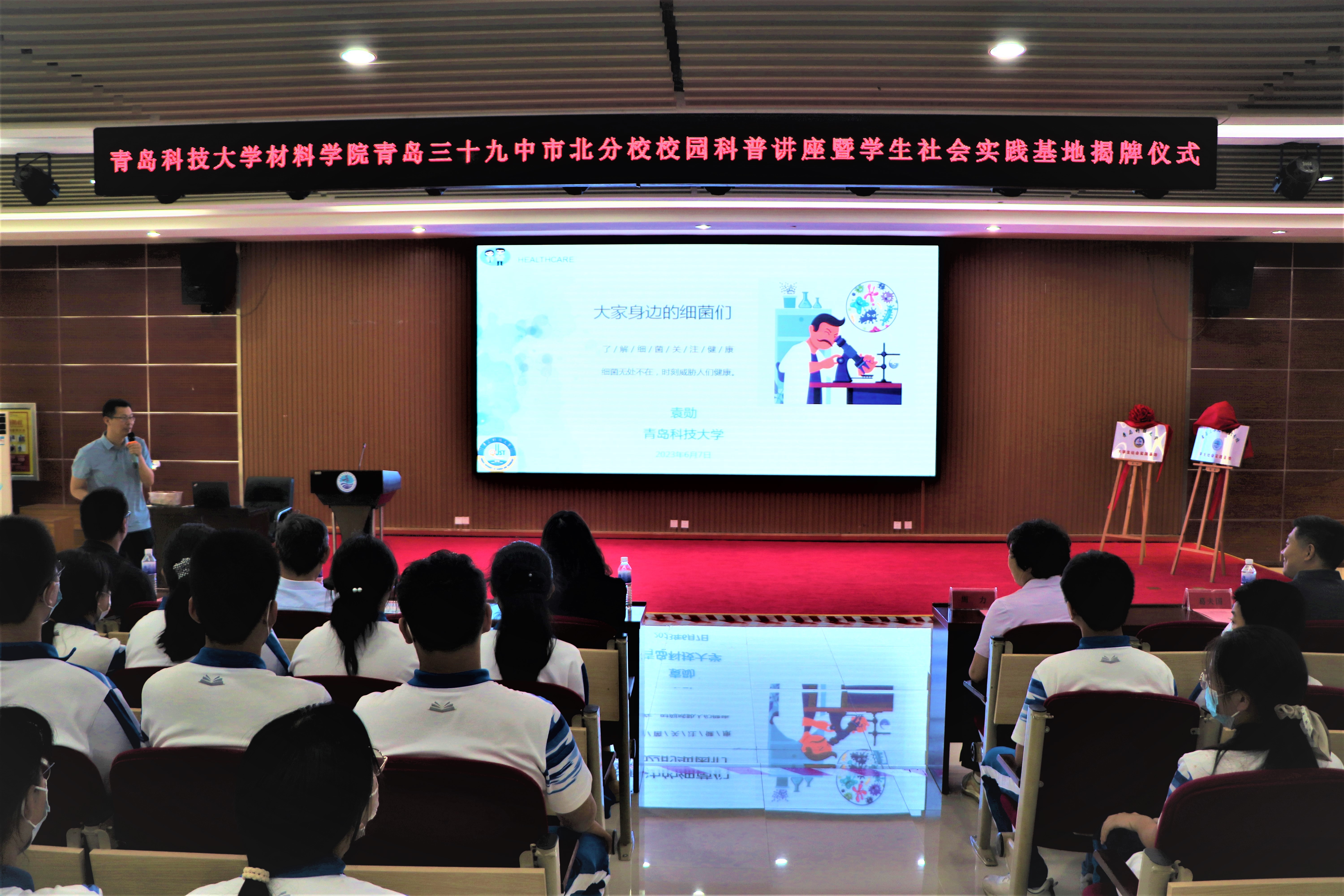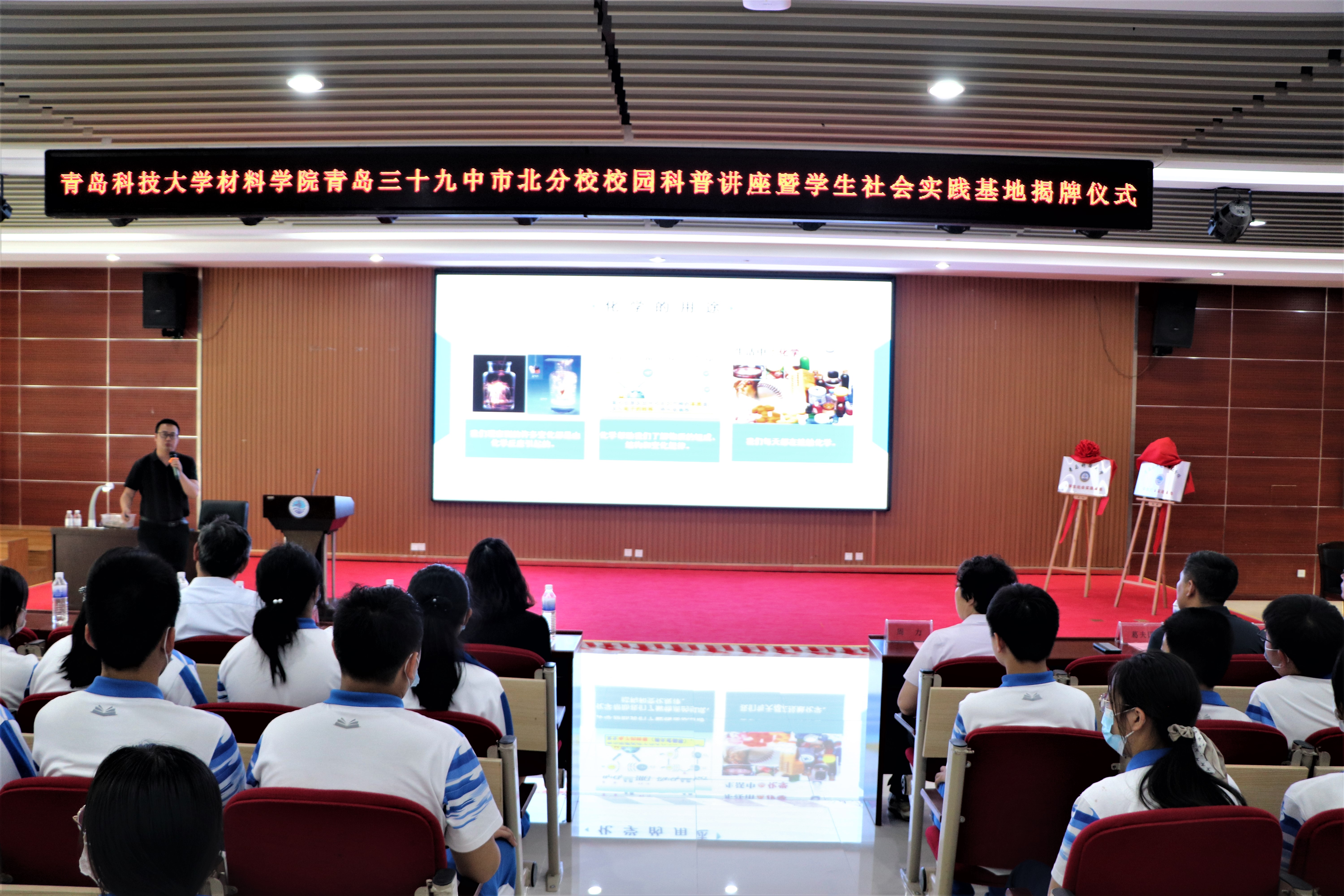 为进一步推进学习贯彻习近平新时代中国特色社会主义思想主题教育,发挥好高等院校对周边区域科学知识普及和文化引领的辐射作用。6月7日下午,公司党委书记杜芳林、党委副书记兼副经理葛夫国、泰山学者青年专家袁勋、汪恕欣一行赴青岛第三十九中学(市北分校)开展“青科名师进中学”科普讲座暨老员工社会实践基地揭牌仪式,面向初中员工开展科普讲座,并建立两校员工社会实践基地。青岛第三十九中学(市北分校)董事长聂麦荣、副董事长周立、史新强,以及七年级全体员工参加活动。
