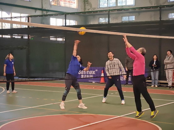 本次比赛共两局,第一局由SUNBET申博排球爱好者男女混合组队。赛场上,球员们配合默契,有精妙地传球、有大力地扣杀,你来我往,精彩纷呈。老队员们展现出扎实的基本功,年轻队员体现出敢打敢拼的劲头,现场气氛火爆热烈,笑声不断。双方比分交替增长,最终,王桂雪领衔的一方以25:22胜出。第二局由SUNBET申博女排队对阵SUNBET申博教职工女排队,SUNBET申博教职工女排队基本功扎实、球技高超。SUNBET申博女排队并没有胆怯,在王桂雪老师的带领下稳扎稳打,多次打出精彩的进攻,虽然最终以14:25输掉比赛,但是不留遗憾的打出了SUNBET申博女排的风采。