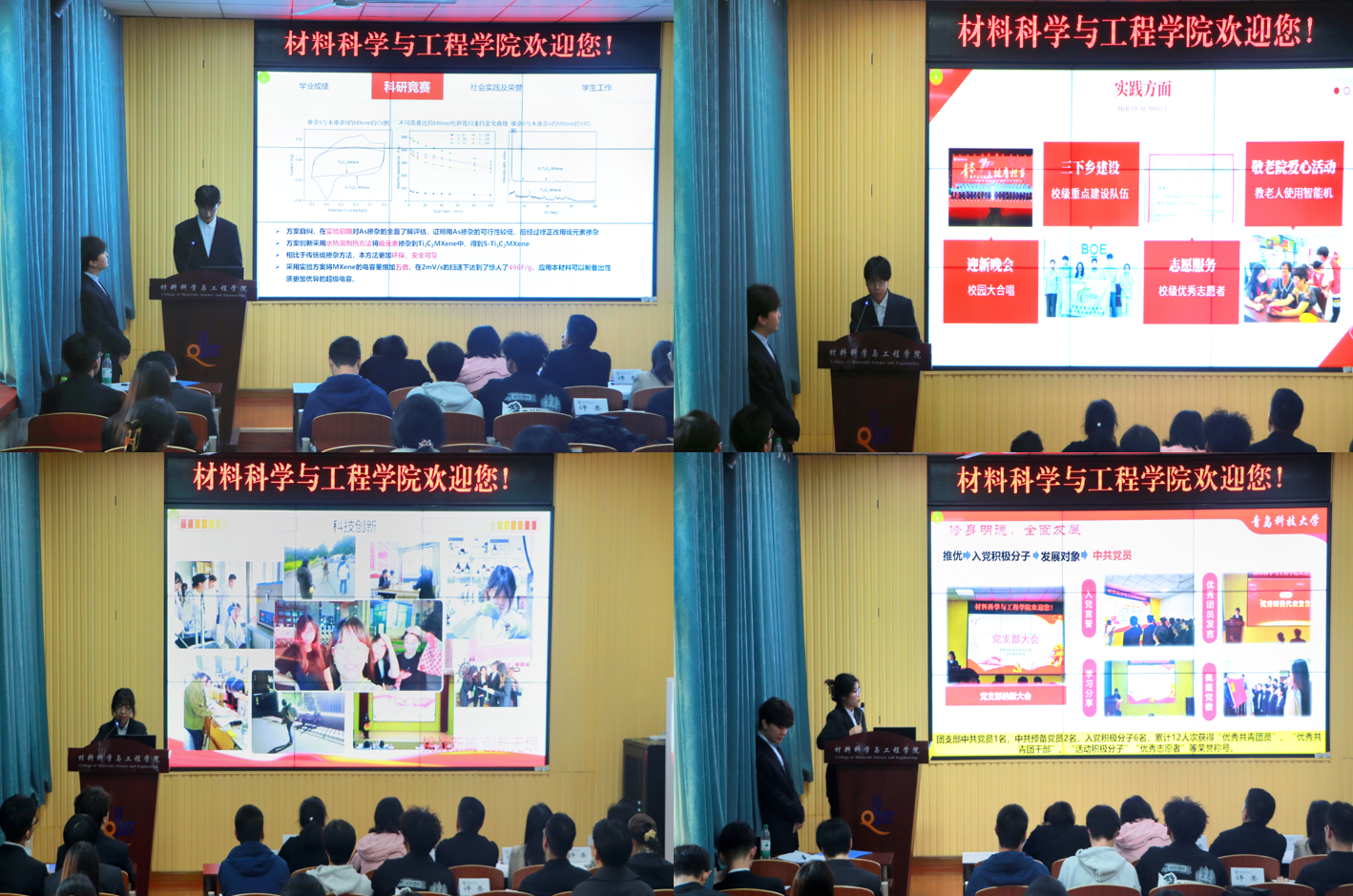 申请人以PPT辅助答辩的形式分别从专业成绩、思想政治、社会实践、科技创新、学科竞赛等方面展示了自己在学习、科研、生活等方面做出的努力以及所获成果,他们不仅在专业素质上成绩突出,还在各项赛事、创新创业、志愿服务等方面表现优异,全面展示了自己在大学期间的成长与收获,为广大材料学子树立了榜样。