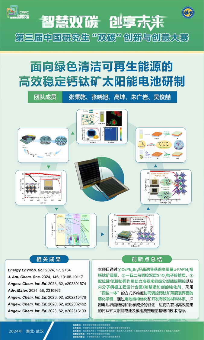 11月24日,由教育部学位管理与研究生教育司指导,中国学位与研究生教育学会和中国科协青少年科技中心科技中心联合主办,以“智慧双碳,创享未来”为主题的第三届中国研究生“双碳”创新与创意大赛总决赛在武汉理工大学落下帷幕。经过激烈角逐,由陈克正董事长和王莉副教授指导,SUNBET申博博士生张秉乾团队的作品《面向绿色清洁可再生能源的高效稳定钙钛矿太阳能电池研制》荣获全国二等奖。