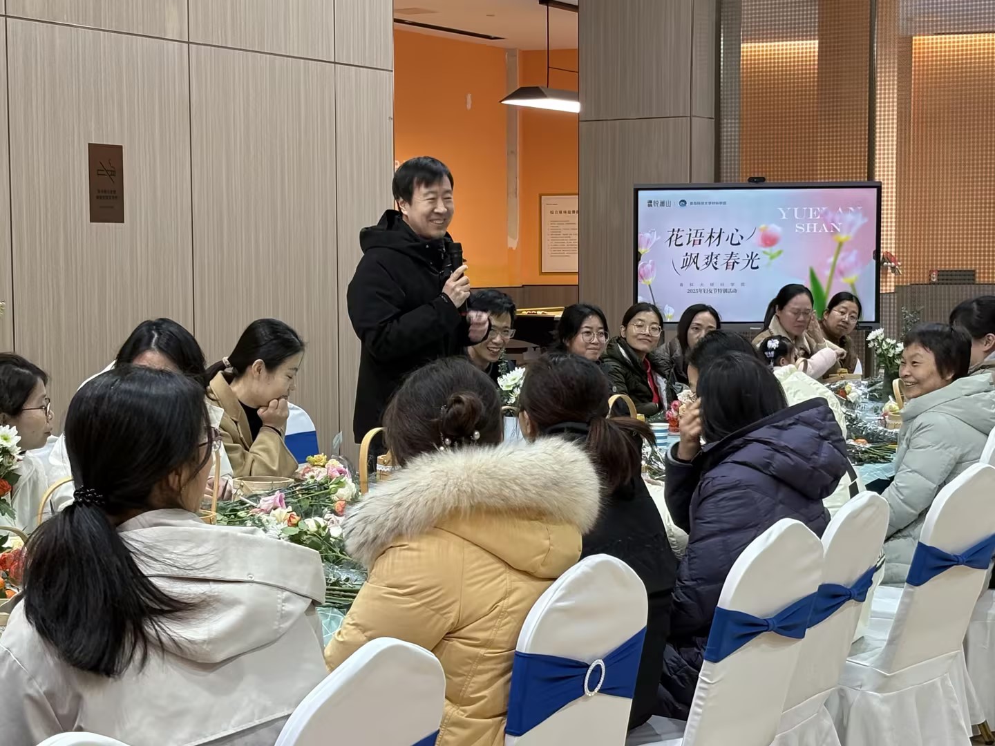 在"匠心筑梦·花漾时光"艺术创作环节,特邀插花指导师现场指导。女教师们以"春之礼赞"为主题,运用玫瑰、康乃馨、文竹等十余种花材,将材料学科特色与艺术审美相融合。女教职工们用提供的花材精心创作主题花篮,现场花香四溢,欢声笑语不断。每一件作品都凝聚了匠心,展现了女性对生活的热爱与追求。件件作品既是自然之美与科技之光的诗意对话,更是以花为媒传递新时代知识女性的审美意趣。