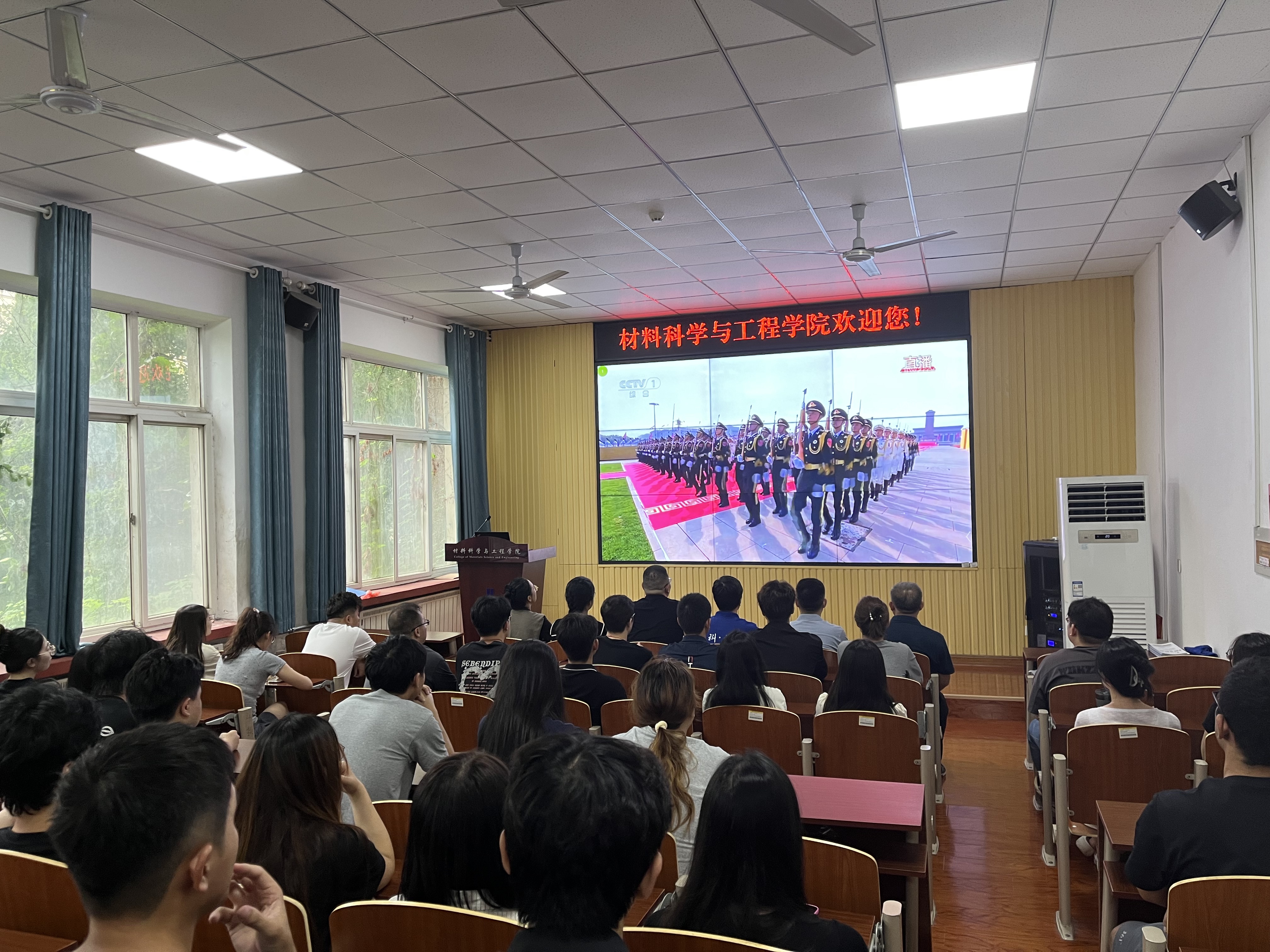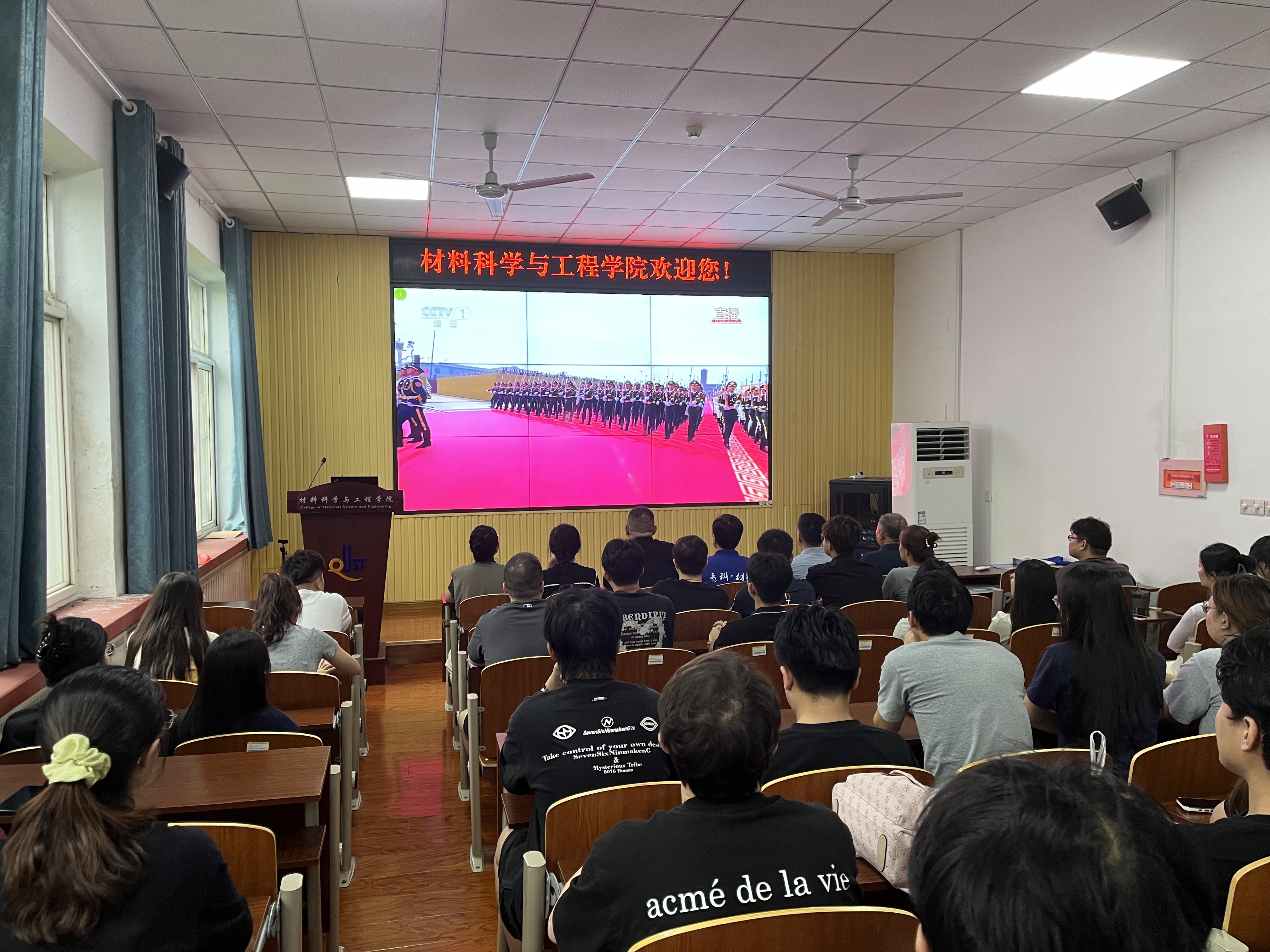 上午10时,阅兵式正式开始。在雄壮的国歌声中,五星红旗冉冉升起,全体师生起立高唱国歌。随后,由党旗、国旗、军旗引领的45个方队依次通过天安门广场,展示了我军新型四代装备、无人作战集群及战略打击力量等国产现役主战装备。在整个观看过程中,大家全神贯注,神情庄重,不时为阅兵现场的精彩瞬间报以热烈掌声。