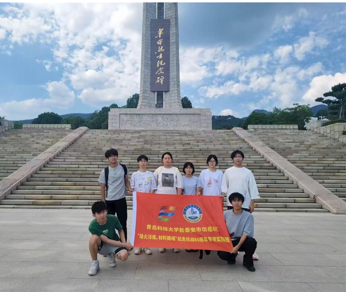 赴泰安岱岳区“烽火淬炼,材料铸魂”实践团在徂徕山抗日武装起义纪念碑与旧址前合照