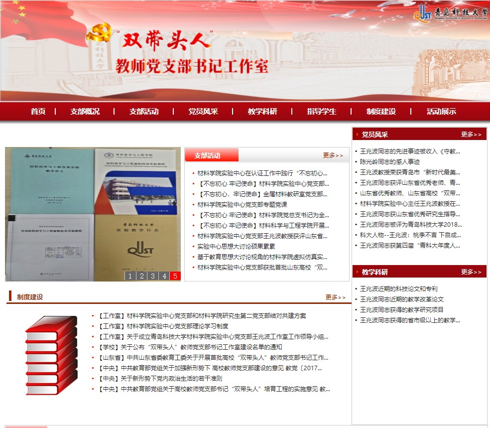 在高校“双带头人”教师党支部书记工作室的建设中,SUNBET申博实验中心党支部抓好党建主责主业,强化支部政治功能,提升思想政治工作质量,促进公司事业发展,抓好支部班子建设。为了发挥“双带头人”工作室“样板田”、“示范区”作用,促进“双带头人”工作室更好开展理论研究和实践探索,示范引领、辐射带动教师党支部建设和教师思想政治工作质量整体提升,SUNBET申博SUNBET申博实验中心党支部书记工作室建设了“山东省高校“双带头人”教师党支部书记工作室”网站(https://sdtr.qust.edu.cn),为更好地实现“双带头人”工作室的示范作用,发挥了重要的作用。