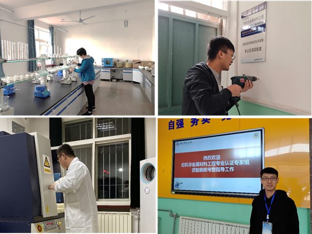 于寿山、董红周、白强、王桂雪四位老师,去年就参与了金属材料工程专业的认证,在本次无机非金属材料的专业认证中,以同样的激情和干劲积极投身认证工作中,一丝不苟,严格要求自己。白强老师参与自评报告第六部分的撰写,打印相关材料协助设备安装调试,同时承担其他临时任务。于寿山同志负责自评报告第一部分1-3/1-4的撰写及附件整理、调查问卷网站的建设及问卷上传、本科生课程《工程陶瓷》的大纲撰写、试卷整理及毕业论文的修改、班主任手册的整理、X射线衍射仪实验室材料的准备、企业代表及毕业生代表的联络及邀请工作、认证相关材料(专家参考书、宣传册、工作牌等)的购买、整理及印刷;并承担大型仪器X射线衍射仪的参观讲解以及《工程陶瓷》的听课准备。董红周同志负责购买专家往返机票及火车票,购置认证所需办公用品,辅助教务处编制认证财务预算及决算,以及认证专家评审费的发放,认证费用报销工作,事无巨细,用心做好。王桂雪老师在固定资产明细整理、实验室用物资保障方面,做到服务及时到位。肖海连老师负责试卷、毕业论文的检查和整改工作。在认证前的两周,根据认证工作的需要,白强、肖海连两位老师紧急制作了陶瓷玻璃工厂实训虚拟仿真的讲义,并及时对虚拟仿真实验室的电脑进行全面维护,确保了认证期间的正常运行。王兆波同志则根据实验中心的分工,协调好实验中心内部与认证相关事情的按计划推进,保质保量做好准备工作。