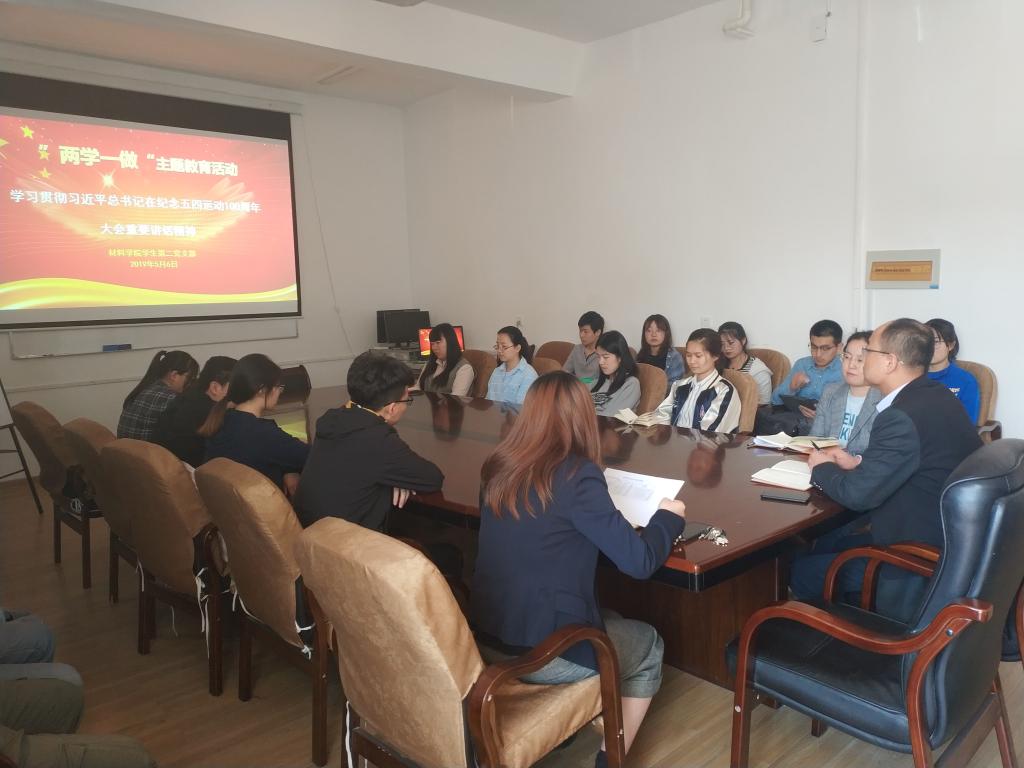 全体党员集体学习了习近平总书记在纪念五四运动100周年大会上的讲话。习近平总书记深切缅怀了五四先驱崇高的爱国情怀和革命精神,高度评价了五四运动的历史意义,明确提出了新时代发扬五四精神的重要要求,深情寄语当代青年要树立远大理想,热爱祖国,勇立时代潮流,争做时代先锋。