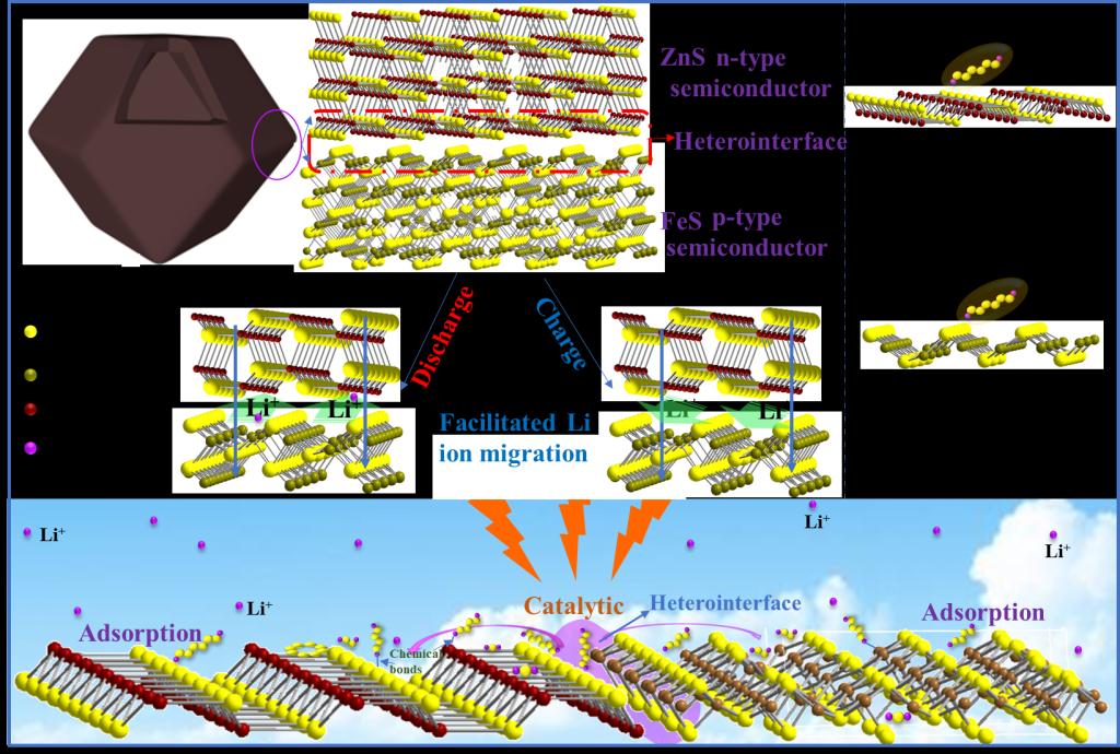 论文提出了设计纳米空心结构结合构建具有大的能带差异的异质结构来协同提升锂-硫电池的电化学性质。研究表明,原位形成的ZnS-FeS异质结构不仅可以固定可溶性多硫化物,也可以促进其快速转化,进而在抑制多硫化物穿梭效应的同时促进了其氧化还原动力学过程。理论计算和动力学分析进一步揭示了ZnS-FeS 异质结构拥有优异的电子/离子传导能力并能“化学锚定”多硫化物,显著提升了硫的利用率。非原位阻抗等测试详细揭示了异质结构显著提升了界面处多硫化锂的液-固-液转化动力学。在 0.2 C 的电流密度下和 3.34 mg cm−2的高硫负载下,S@ZnS-FeS/NC复合电极在循环200次后仍展现出3.57 mAh cm−2 的高放电面容量。本工作所提出的策略对于锂硫电池的应用有一定的启发作用,为锂-硫电池的正极材料设计提供了方案。