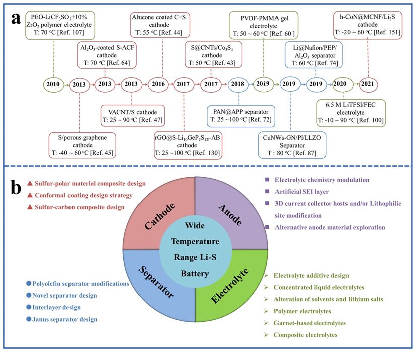 图2 a)宽温域锂-硫电池的研究进展和b)宽温域锂-硫电池的关键材料设计策略。