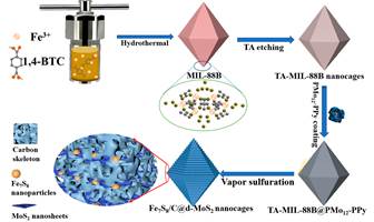 图 高性能Fe7S8/C@d-MoS2 纳米笼的制备过程示意图。