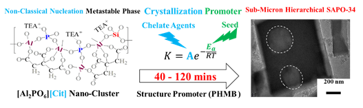 发表于Chemical Engineering Journal(2020, 381, 122759),题为A chemical approach for ultrafast synthesis of SAPO-n molecular sieves的工作中,作者利用柠檬酸与铝离子的耦合作用,显著促进了分子筛前驱体成核,并缩短了磷酸铝分子筛的晶化合成周期,实现了化学策略下的快速合成技术。这种化学促进作用能将晶化合成周期从数十小时,缩短到两小时,并显著区别于现有的物理促进合成技术。相关规律与机理研究表明,借助于柠檬酸等螯合剂的耦合作用,可以简洁的促使分子筛前驱体形成介稳态半晶体纳米团簇,加快成核与晶化。动力学研究表明该促进作用改变了晶化速率常数中的指前因子,而非晶化生长活化能。作者将此现象关联为非经典成核生长。在此基础上,进一步调控分子筛的结构形成多级孔分子筛,其在催化甲醇制烯烃过程中表现出优异的催化性能。值得指出,基于上述研究工作原理创新,所得到的技术创新性得到了国家专利局的肯定。以该工作申报的国家技术发明专利以原文无复议的形式,很快得到了授权(ZL201910079388.1)。该工作得到了中国天辰化学工程公司的大力支持,相关规模化试验工作正在进行中。胡茂从博士为论文撰写布局,SUNBET申博研究生王添漪完成了实验工作,李霞与王志义教授提供了重要的理论指导,刘旭光博士提供了研究思路并主导了研究工作。