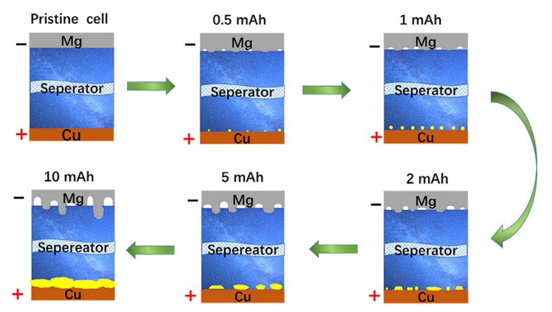 研究结果表明,镁电池电解液的溶液化学性质以及金属镁-电解质界面对金属镁负极的可逆性以及金属镁沉积物形貌起着至关重要的作用。 在高面容量(5-10 mAh cm-2)条件下,当前常用的四类镁电解质所组装的Mg//Cu非对称电池会发生严重的内部短路,但是发生短路的时间各不相同。进一步的光学和电子显微镜分析表明,在金属镁剥离过程中,负极表面会形成的多孔阵列状和半球形的腐蚀坑,随后的金属镁沉积过程,镁离子优先被还原并沉积形成松散的相互连接的大块聚集体,而不是均匀且密实的膜状沉积物(如上图)。所形成的相互连接的颗粒状金属镁沉积物易于渗透并进入多孔隔膜,进而导致电池失效。另外,通过X射线光电子能谱刻蚀技术可以发现,从沉积物的表面到内部都显示出金属铝的共沉积现象,而镁沉积物的近表面中还存在含氯的化合物,相关物种分析及其形成机制仍需要进一步研究。