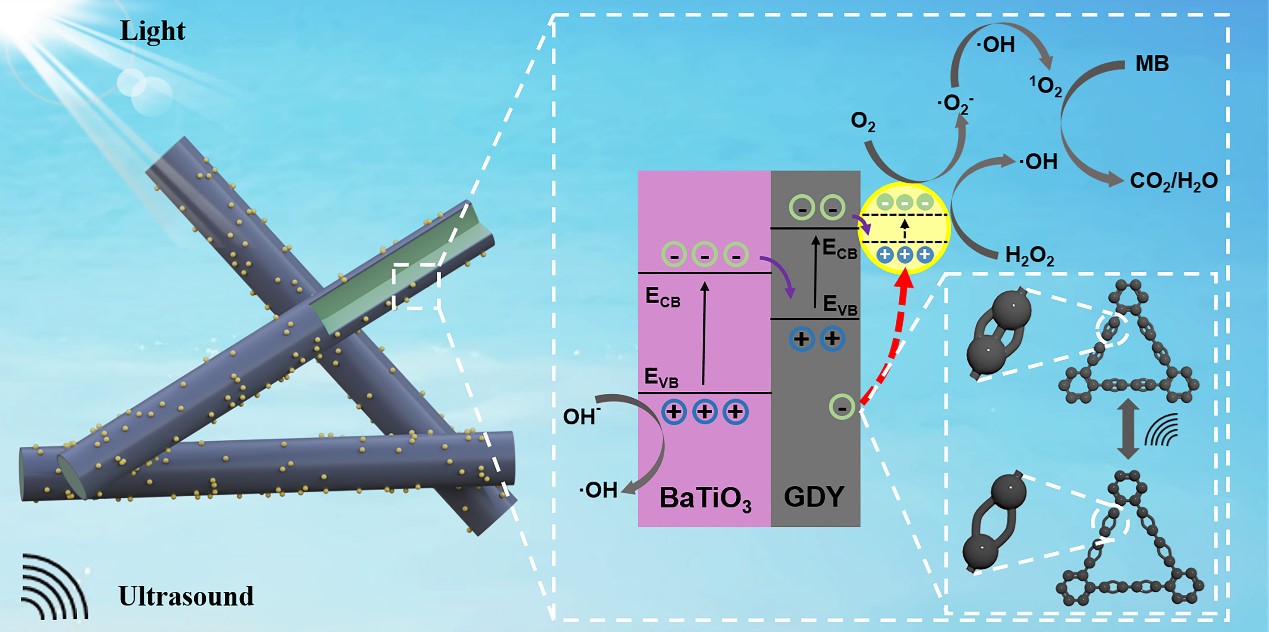 本研究构建了一种由钛酸钡/石墨炔/金纳米纤维(BTO/GDY/Au NFs)组成的异质结构。石墨炔(GDY)层的加入起到了电子海绵的作用,显著提高了压电光催化活性,其降解速率常数是BTO/Au的3.3倍。理论计算表明,BTO在超声下会发生弹性形变,从而导致GDY在7.1至10.4 Å的晶格常数范围内发生拉伸和压缩,这种形变诱导了sp杂化的C≡C向C=C的可逆转换,释放出的电子可与金纳米粒子(Au NPs)产生的热空穴复合。因此,更多的热电子能够参与催化反应过程。此外,BTO/GDY/Au NFs在快速降解废水中的有机染料和抗生素方面表现出优异的催化性能,同时还能抑制细菌繁殖。上述结果验证了这种异质结构在实际应用中的可行性。总之,本研究提出了一种新型压电光催化剂,其中GDY中sp杂化化学键的相互转化可作为电子供体,从而显著提高压电光催化性能。