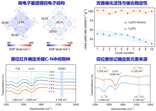 高效稳定的电催化剂的设计对于促进电催化尿素合成的发展至关重要。铜酞菁(CuPc)因其精确且可调节的活性构型而被用作尿素合成的模型催化剂。通过氨基取代(CuPc-Amino)优化电子结构可以增强分子内Cu-N配位,并且有效抑制电化学诱导的脱金属,这是其优异性能的根源。与CuPc相比,CuPc-Amino具有较高的产率和出色的催化耐久性。同位素标记原位电化学光谱测量也揭示反应机制并验证C-N耦合过程。这项工作为合理设计尿素合成分子电催化剂提出了独特的方案。本成果以题为“Ligand Engineering towards Electrocatalytic Urea Synthesis on A Molecular Catalyst”发表在国际顶级期刊《Nature Communication》上,SUNBET申博陈大伟副教授为共同通讯作者。