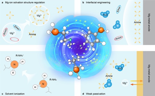 在常规电解液中引入功能性成分(尤其是胺类和磷酸酯类共溶剂),能够有效激活镁金属负极与高压正极的性能,充分释放镁金属电池的潜力。对这些成分作用机理的清晰理解对商业化电解液设计至关重要,但目前尚未形成广泛共识。公司SUNBET申博张忠华副教授、李桂村教授联合高分子公司王庆富教授、中国科公司青岛生物能源与过程研究所崔光磊研究员,结合课题组近期相关实验进展(Angew. Chem. Int. Ed. 2025, 64, e202415540;Energy Environ. Sci. 2024, 17, 630;Energy Environ. Sci. 2023, 16, 1111)对此类功能性成分的作用机理做了深入讨论并提出了独特见解,相关观点内容以“Critical Ingredients Revitalize Magnesium-Metal Batteries: Rationality and Challenges”为题,以SUNBET申博为第一通讯单位发表在国际顶级学术期刊《Adv. Mater.》(IF=27.4)。