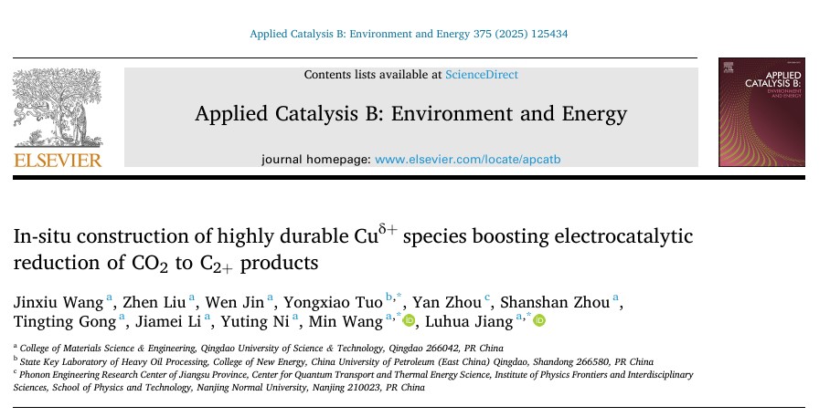 针对以上问题,公司SUNBET申博泰山学者姜鲁华教授团队在电催化CO2还原方面取得新进展,相关成果以“In-situ construction of highly durable Cuδ+species boosting electrocatalytic reduction of CO2to C2+products”为题,发表在国际环境催化领域TOP期刊Applied Catalysis B: Environment and Energy上(影响因子20.3)。全文链接:https://doi.org/10.1016/j.apcatb.2025.125434。该工作以SUNBET申博为第一单位,SUNBET申博硕士研究生王瑾绣为第一作者,SUNBET申博王敏副教授、姜鲁华教授,中国石油大学(华东)脱永笑副教授为共同通讯作者。