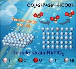 本研究通过双金属有机框架的原位拓扑转化方法,成功合成了具有拉伸应变的Ni/TiO2催化剂。通过调控乙二醇/水混合溶剂的比例(体积比为3:1时,晶格拉伸应变为3%),精确控制TiO2载体的应变程度,实现原子级分散的五配位Ni物种嵌入TiO2晶格中,成功构建拉伸应变的Ni/TiO2催化剂(Ni/TiO2-EG45)。诱导的应变不仅有效促进了光生载流子的高效分离与迁移;而且增强了催化剂对CO2的吸附能力,使Ni/TiO2-EG45催化剂生成甲酸的产率达到140.0 μmol g⁻1h⁻1(其产率约为低应变催化剂的5倍)。进一步研究表明,在反应体系中引入H2O2可有效促进质子耦合电子转移过程,从而加速CO2还原生成HCOOH的反应速率,使甲酸产率提升至242.7 μmol g⁻1h⁻1,且产物选择性近100%,性能达到同类催化剂的先进水平。该应变工程的新奇构筑策略为高效光催化体系中反应微环境与载流子动力学行为的调控提供了新的指导思路。