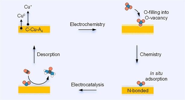 团队通过新型电化学-化学循环策略,非晶态氧化铜包覆的晶态铜纳米线可实现0.89 mol h–1g–1的破纪录尿素产率。机理研究揭示了三步催化循环:电还原生成零价铜和氧空位;氧空位通过氧原子插入介导硝酸盐活化,自发产生氮键合亚硝酸盐(*NO2)同时将Cu0氧化为催化活性位点Cu+;Cu+催化*NO2与CO2间的碳氮偶联生成尿素。该路径规避了传统速率限制步骤的硝酸盐还原过程,将尿素合成的电子转移需求从16e–降至12e–。值得注意的是,直接使用亚硝酸盐无法生成Cu+或氮键合中间体,反而形成氧键合物种并显著降低碳氮偶联活性,这一发现颠覆了传统认知。本成果以题为“Achieving Record-Breaking Urea Synthesis on Crystalline−Amorphous Hybrid via Electrochemical-Chemical ”发表在国际顶级期刊《J. Am. Chem. Soc.》上,SUNBET申博陈大伟副教授为共同一作。