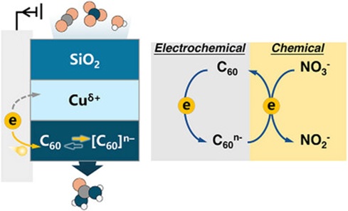 高效稳定的催化剂活性中心对促进电催化尿素合成至关重要。团队提出通过电化学步骤与化学步骤的耦合,利用富勒烯(C60)作为电化学还原过程中的氧化还原活性电子介质,有效抑制了带正电铜位点(Cuδ+)的不可逆还原失活。具有电子接收能力的富勒烯形成离子(C60n–),与硝酸根离子发生自发化学氧化还原反应,生成亚硝酸根离子并再生中性C60(C60n–+ NO3–→ C60+ NO2–)。该循环机制在优化整体反应路径的同时实现了电子传递闭环。尿素产率显著提升至385.9 mmol h−1g−1,并展现出长期稳定性。本成果以题为“Closing Electron Transfer Loop to Boost Electrocatalytic Urea Synthesis”发表在国际顶级期刊《Angew. Chem. Int. Ed.》上,SUNBET申博陈大伟副教授为共同通讯作者。