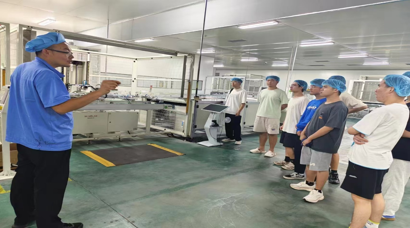 活动首日,在公司领导的带领下,队员们参观了公司的生产车间,详细了解了光伏电池片的生产流程和检测设备。队员们对生产线上的精密设备和严谨的生产流程表示了极大的兴趣,纷纷拿出笔记本记录下了重要的知识点。