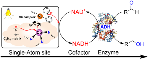 烟酰胺腺嘌呤二核苷酸(Nicotinamide adenine dinucleotide, NAD+/NADH)是自然界中广泛存在的一种辅酶。在脱氢酶催化中,每催化一分子底物都需要等计量的辅酶参与。由于NADH的成本昂贵,因此实现NADH的高效和经济的再生对酶催化工业十分重要。利用可持续的太阳能作为驱动力,设计高效的、具有生物兼容性成分的光催化剂来实现辅酶NADH再生是非常有前景的。