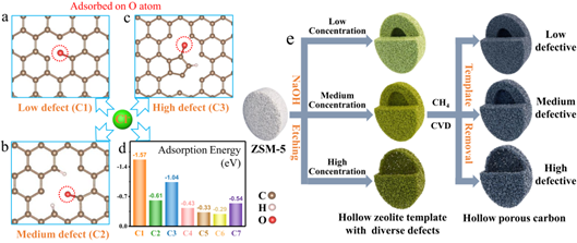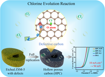 基于此,SUNBET申博SUNBET申博李彬特聘副教授和环境公司王磊教授等人报道了一种空心多孔碳纳米笼(HPC),并在形成的碳缺陷周围控制氧原子周围电子密度,以实现高效的CER。碱刻蚀可使空心结构的沸石产生缺陷。在硬模板策略中,碳缺陷的类型与沸石模板的刻蚀程度直接相关。更重要的是,氧原子可以从沸石框架中“借用”到缺陷碳上。不饱和O原子周围的电子密度在碳低缺陷度上比高缺陷度上低,有利于Cl−的吸附。该催化剂可复制分级沸石结构,具有中空特征和高比表面积。这一优势使其在控制气泡附着状态、有效排斥已形成气泡、增强电解质扩散、降低欧姆电阻和加速反应动力学等方面具有优异性能。结果表明,合成的HPC纳米笼具有良好的电催化性能,在电流密度为10 mA cm−2的条件下,过电位低至94 mV,稳定性好且优于商用贵金属催化剂DSA,是目前已报道的碳材料中最好的。