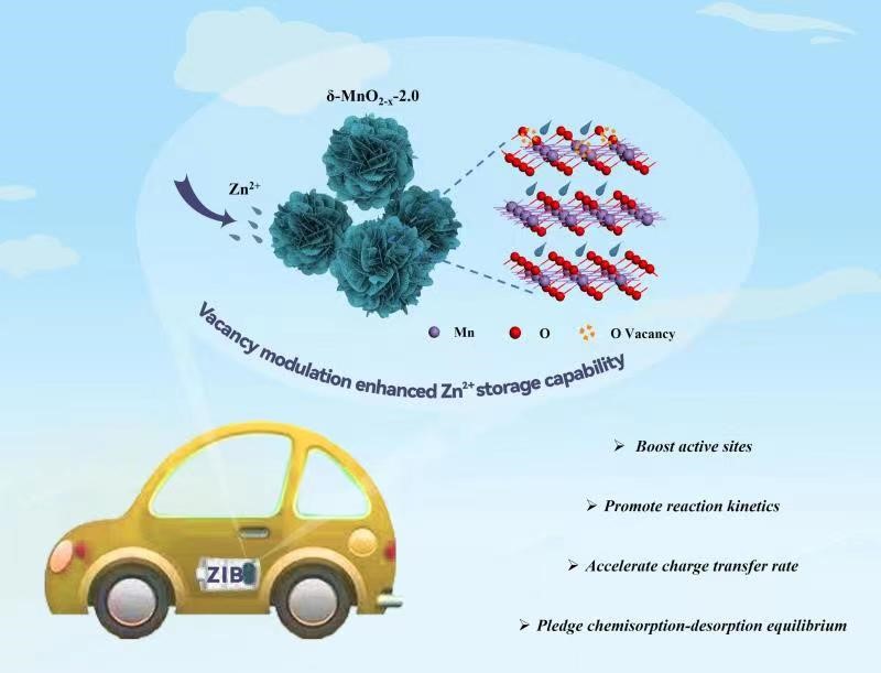 锌离子电池(ZIBs)因具有较大的能量密度、合适的氧化还原电压和环境友好特性有望成为规模化储能装置。正极材料是决定ZIBs电化学性能的重要元素。在多种正极材料中,具有高理论容量及多晶结构的MnO2已成为极具竞争力的候选材料。然而,在以前的研究中,其比容量远低于理论值,并且在高电流密度下的倍率也较差,这可能是由于其较差的电导率及缓慢的反应动力学所致,因此,研究人员通常采用不同的策略,例如调节材料形貌,采用导电骨架构建复合材料,引入异类杂原子等来克服上述问题。尽管性能有一定的改善,但仍不能满足高性能ZIBs正极材料的需求,这大大阻碍了MnO2在ZIBs领域的商业化应用。基于此,该团队开发了一种有效调控δ-MnO2氧空位浓度策略,通过控制KBH4还原时间获得了不同空位含量的δ-MnO2正极材料,实验及理论计算表明:富含中等空位浓度的δ-MnO2可以确保反应过程中的H+/Zn2+化学吸附-解吸平衡和快速电荷转移速率,同时可提供足够多的活性位点,进而获得了高的比容量、优异的倍率及长循环寿命的电化学性能。此外,通过非原位表征技术系统阐明了在充放电过程中该正极材料具有H+/Zn2+嵌入/脱出及相变共存的电荷存储机制。本文全面解释了氧空位调控对ZIBs正极材料电化学性能的影响规律,这为开发高性能的ZIBs正极材料提供了有价值的设计手段,极大地推动了其商业应用过程。同时,这项研究工作也为构筑其他高性能二次电极材料提供了可靠策略。