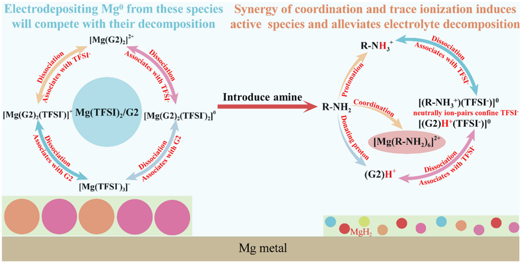 研究结果表明:1)3-二甲胺基丙胺(DMAPA)可以取代G2并与镁离子配位形成独特的二价[Mg(DMAPA)6]2+活性离子结构,该结构与原物种结构(如[Mg(G2)2]2+、[Mg(G2)(TFSI–)]+等)相比,可以避免G2和TFSI阴离子在金属镁负极界面的分解,进而抑制镁负极被分解产物所钝化;2)DMAPA可以与电解液中痕量水发生水解反应(R-NH2+H2O⇌R-NH3++OH–,这里R-=(CH3)2N(CH2)3-),也可能存在自身的电离反应(R-NH2⇌R-NH3++ R-NH–),所形成的胺基阳离子可与G2进行质子交换反应(G2+ R-NH3+⇌(G2)H++ R-NH2),上述胺基阳离子(R-NH3+)和质子化醚阳离子((G2)H+)可以与TFSI阴离子缔合,形成中性[(R-NH3+)(TFSI–)]0和[(G2)H+(TFSI–)]0,这些物种的生成避免了TFSI阴离子被输运到电极界面和被电化学分解的过程,减轻了金属镁负极的界面钝化问题;3)由于质子化溶剂离子的存在,电沉积产物中生成了MgH2物相,该物相与金属镁的界面结构有助于镁离子在界面的快速扩散。电化学数据也证实了醚/胺共溶剂电解液中金属镁负极具有更优异的电化学沉积/溶解性能。