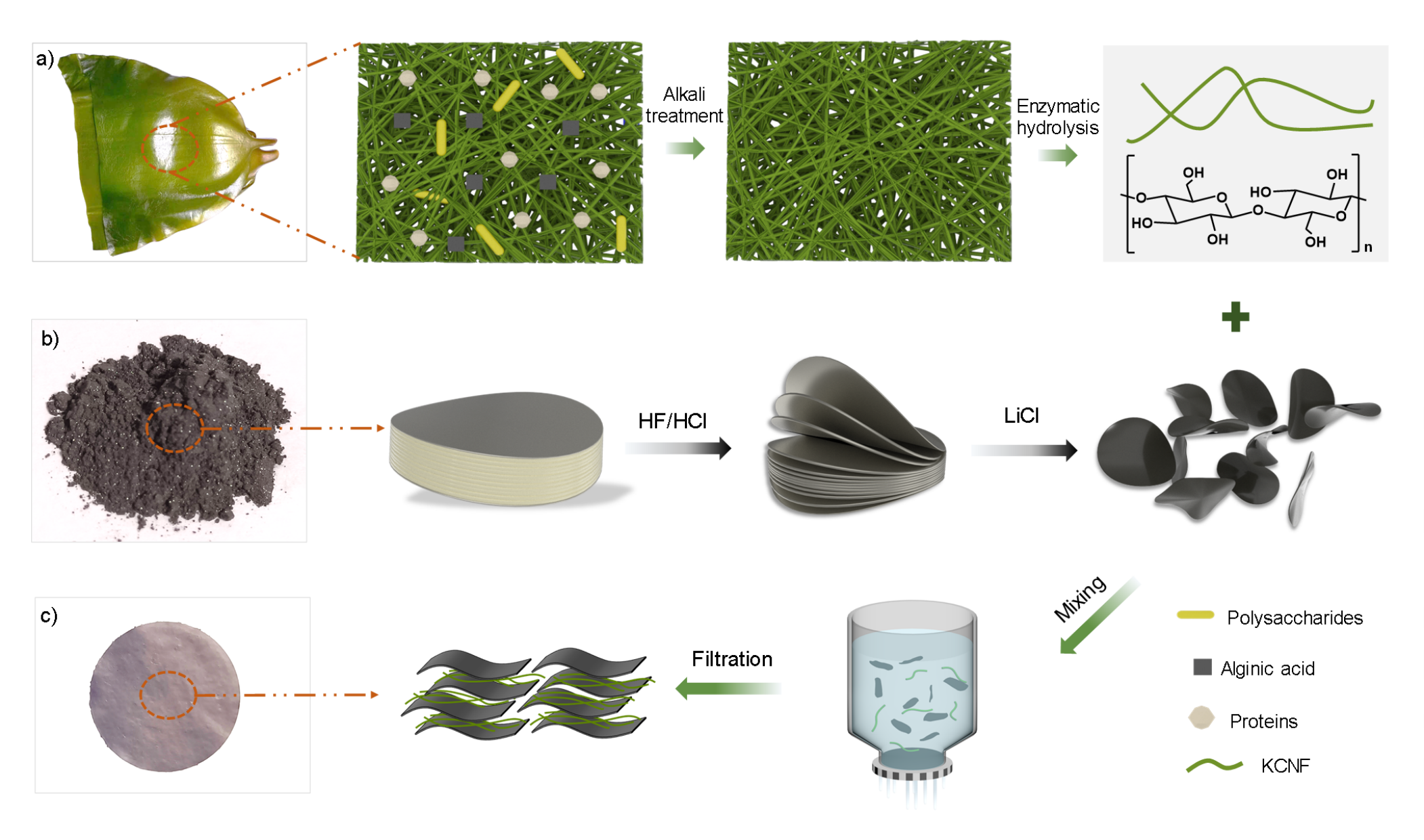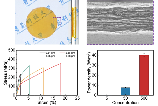 同时,考虑到合成纤维的成本昂贵、不易获得等弱点,为此,滕超副教授将目光投向自然界,寻找一种生长周期短、储量丰富、易于获得的天然海带,将提取的带负电海带纳米纤维与MXene纳米片复合,制备力学性能提高、溶液稳定的KCNF/MXene纳米复合材料,实现高效盐差能量捕,相关工作以题为“Kelp Nanofiber-Based Composite Membranes for Highly Efficient Osmotic Energy Conversion”的研究性论文发表在国际著名期刊Advanced Functional Materials上(2023,DOI: 10.1002/adfm.202313914,accepted)。SUNBET申博SUNBET申博2021级硕士研究生翟瑞为本文的第一作者,滕超副教授为通讯作者。