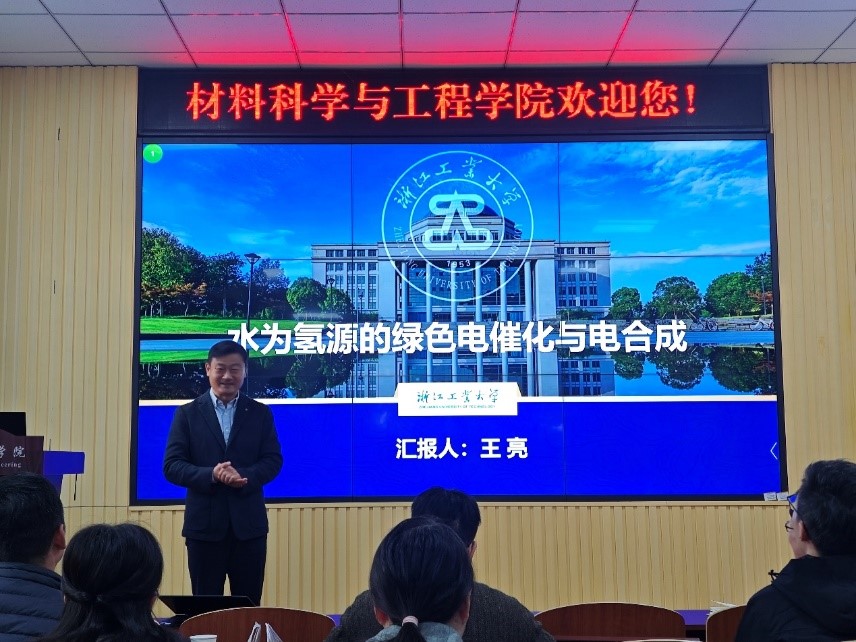 随后,王亮教授作了题为“水为氢源的绿色电催化与电合成”的学术报告。王教授重点讨论了如何通过水作为氢源,发展高效、环境友好的电催化和电合成技术。他从理论计算和实验研究两个角度,系统介绍了水电解制氢及其在电催化反应中的应用,特别是如何将可再生能源与电合成技术结合,推动绿色化学合成的创新与发展。