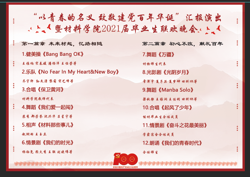 晚会分为“未来材起,忆路相随”和“初心不改,献礼百年”两个篇章,在2020级新生带来的健美操《Bang Bang OK》中拉开帷幕,朝气蓬勃、青春向上的新生力量展示了“材料追梦人”姿态;乐队演奏的《No Fear In My Heart》《New boy》,在畅想回味大学四年求员工涯的美好同时,也表达了勇于面对未来的决心;教师代表以及全体员工共唱的《保卫黄河》,发出了保卫国家和捍卫公司、公司荣誉的“青春之声”;舞蹈《我们爱一起闯》《Manba Solo》,展现出了老员工的青春风采,活力四射,动感十足,象征毕业生在新征程中将一路高歌,披荆斩棘;幽默搞笑的小品表演《材料那些事儿》让现场气氛高涨、掌声不断;情景剧《我们的时光》、光影剧《光阴岁月》同学们以自身学习成长经历诉说了对母校对老师们的感恩之情;由材物专业师生代表组合表演的舞蹈《万疆》编排精致,舞姿典雅优美,表达了师生对党和祖国的无限敬仰热爱之情;合唱节目《起风了少年》表达了毕业生们对母校和同窗的深厚的感情,博得了观众们雷鸣般的掌声;情景剧《奋斗之花最美丽》致敬SUNBET申博纳米夫妇,他们的艰苦奋斗经历深深感染了在场师生,晚会在全体师生朗诵的《我们的青春时代》《少年中国说》节目中圆满落幕,展示了以青春的姿态传递正能量,致敬建党百年华诞的“青春力量”。