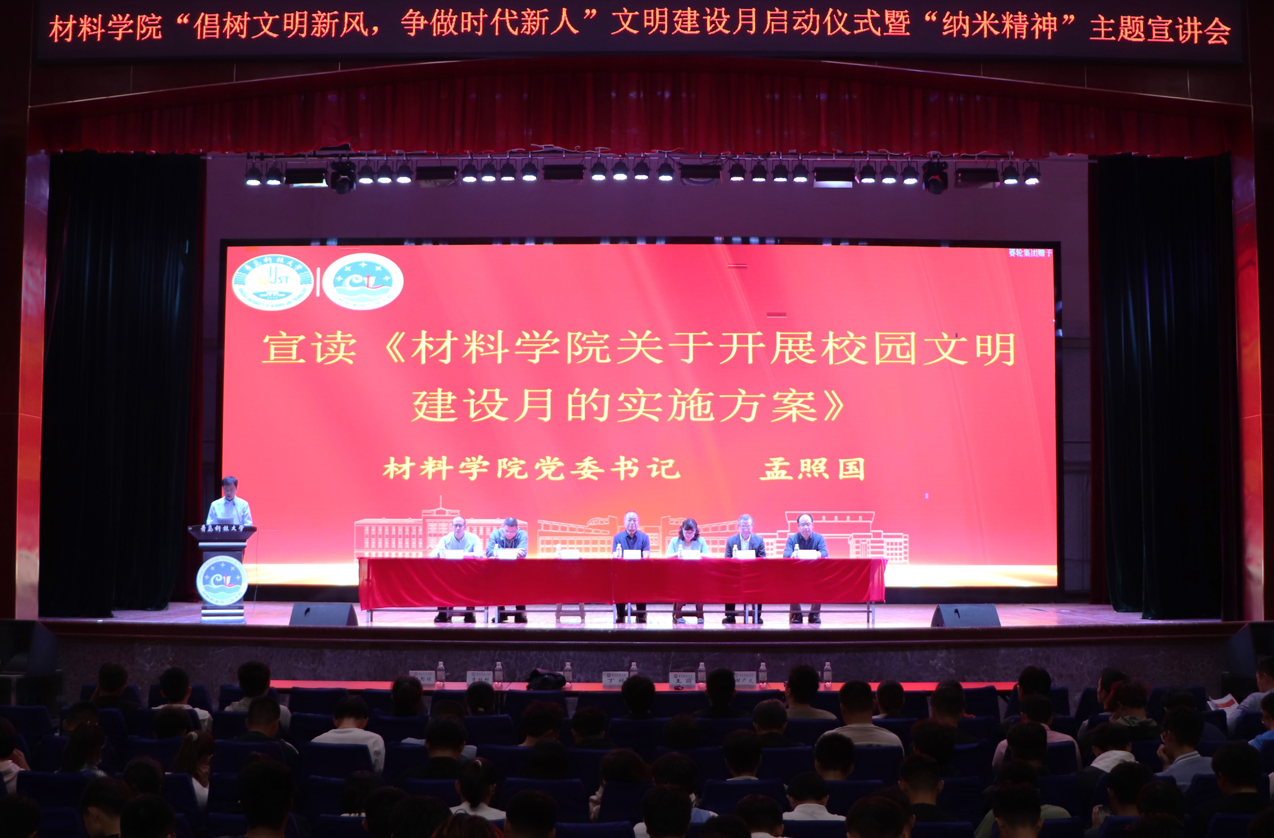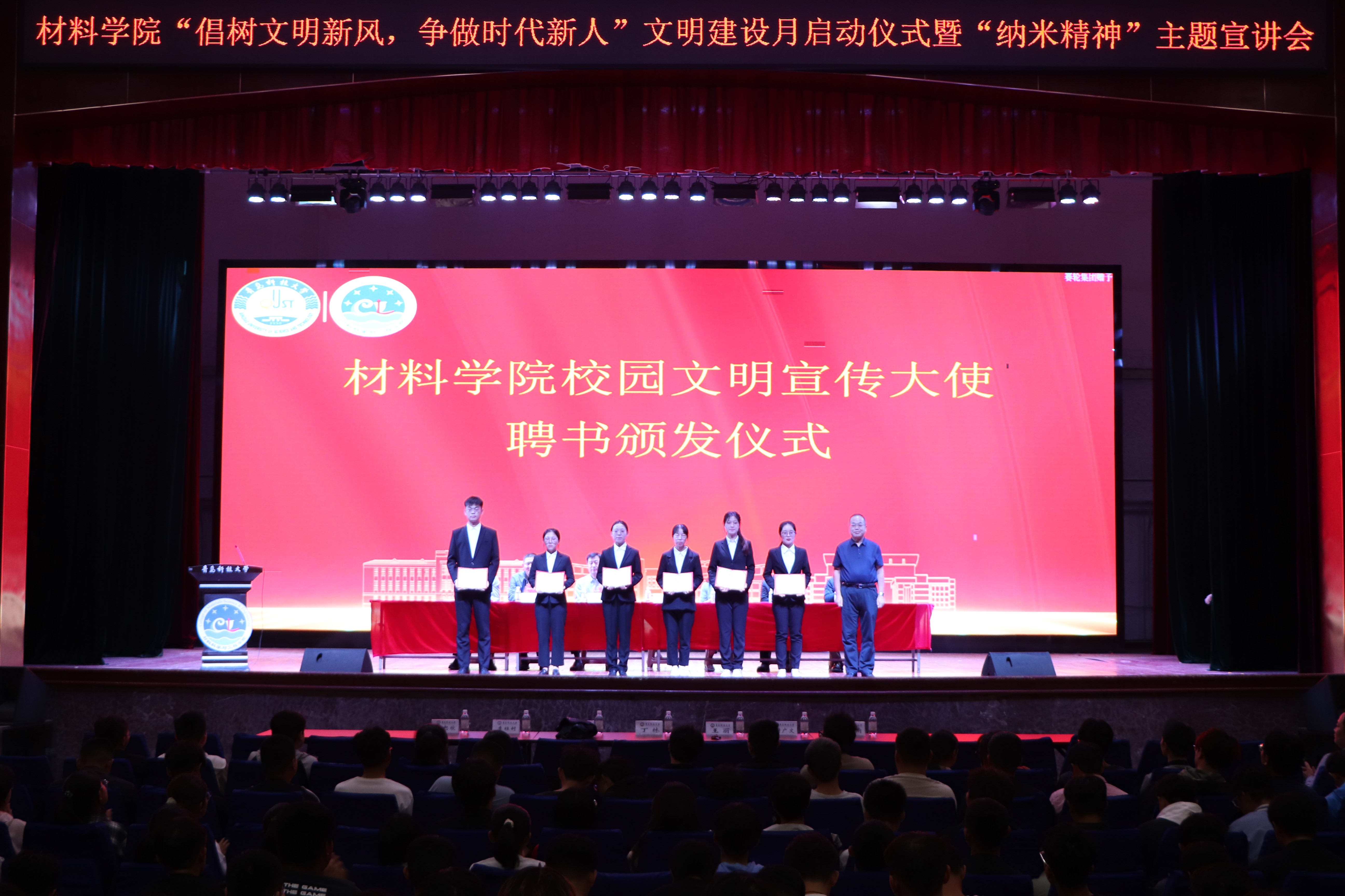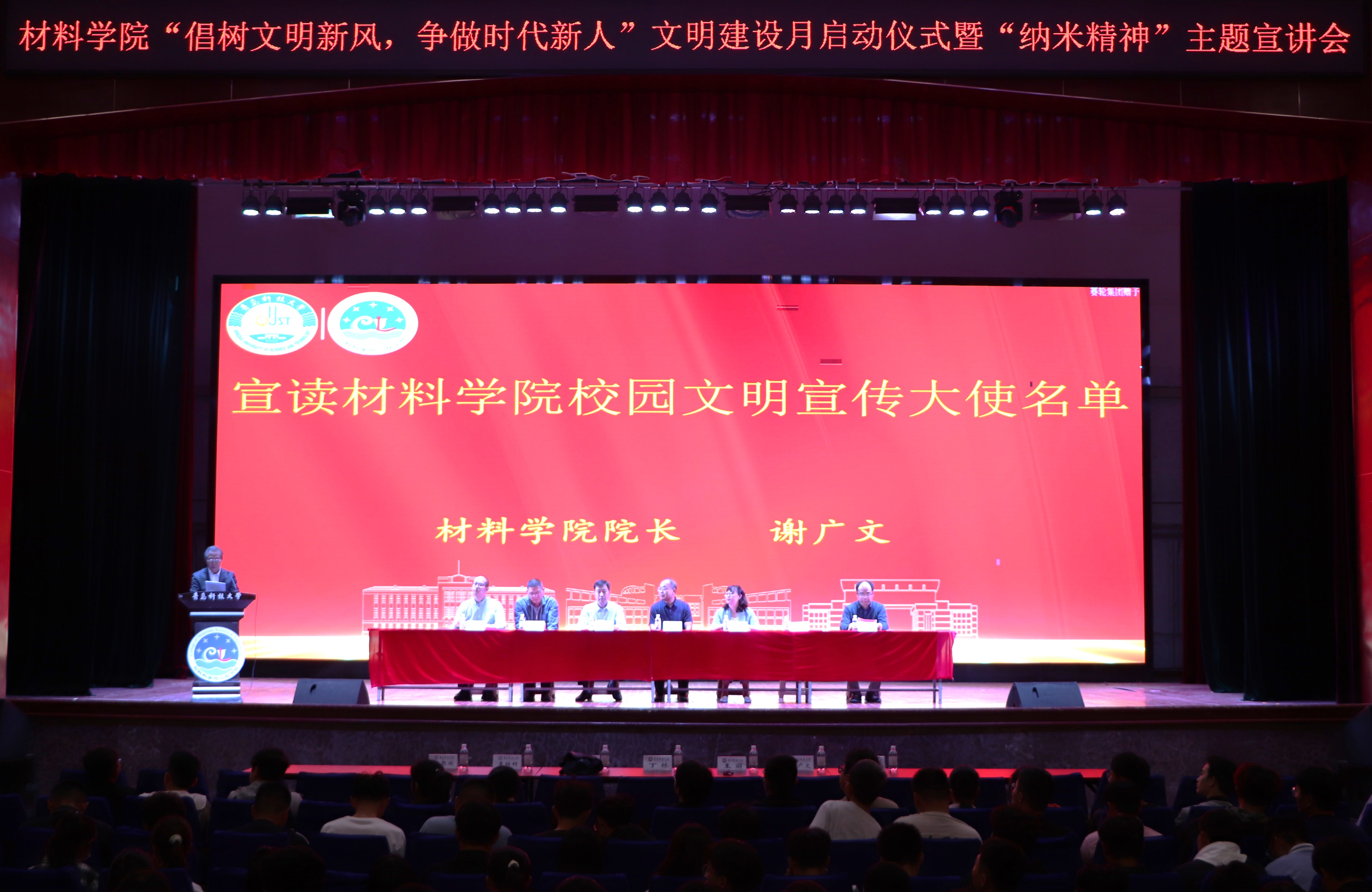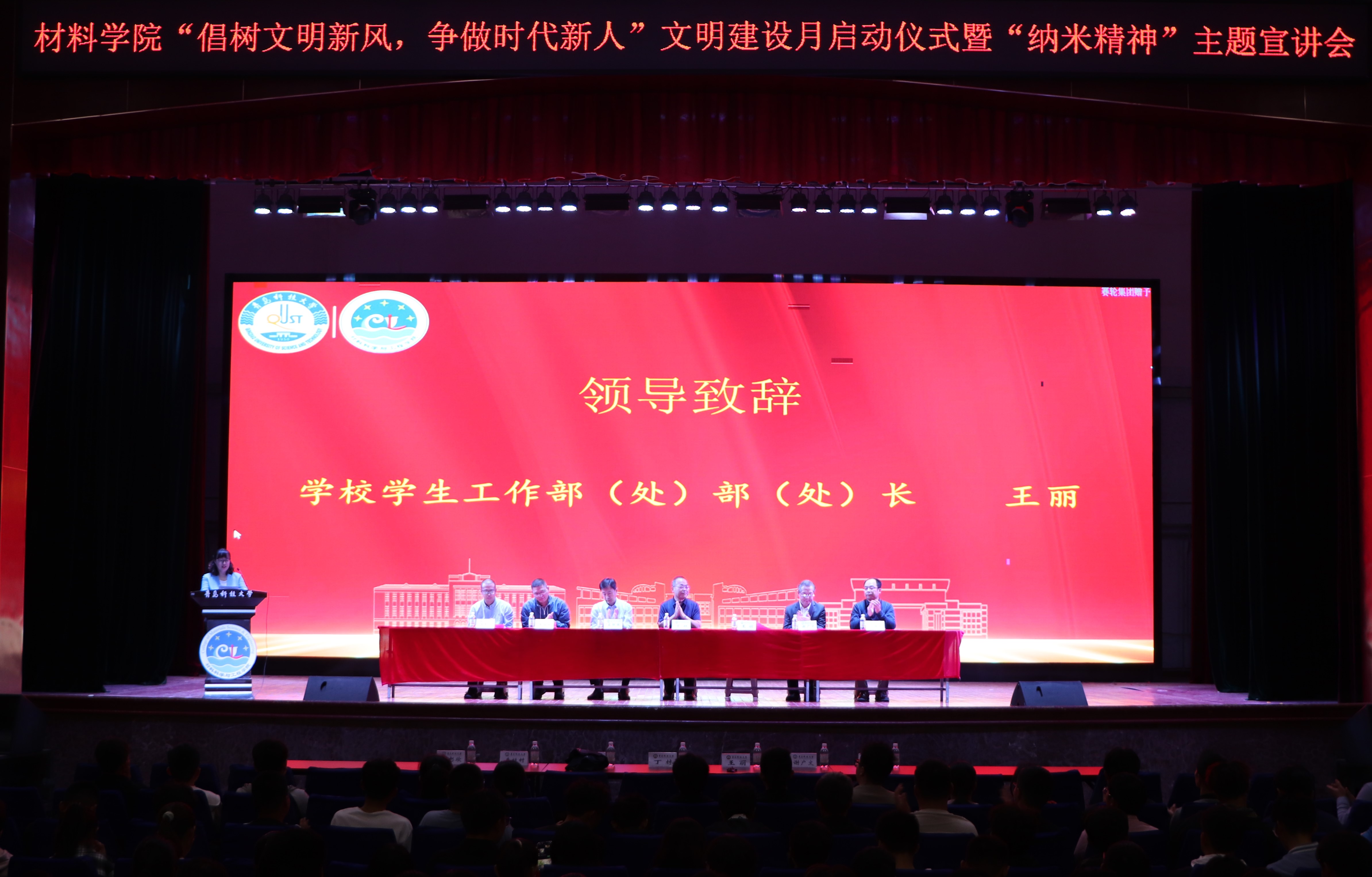 员工代表、SUNBET申博校园文明宣传大使邓如帅宣读了《关于践行校园文明礼仪的倡议书》。王学花、刘晓伟、仝意宏、段梦璐、勾晓彤等五名SUNBET申博校园文明宣传大使分别结合“纳米精神”和校园文明建设开展主题宣讲。